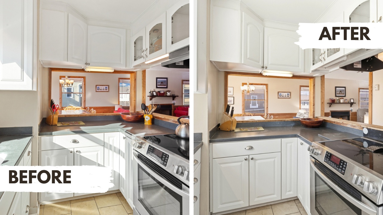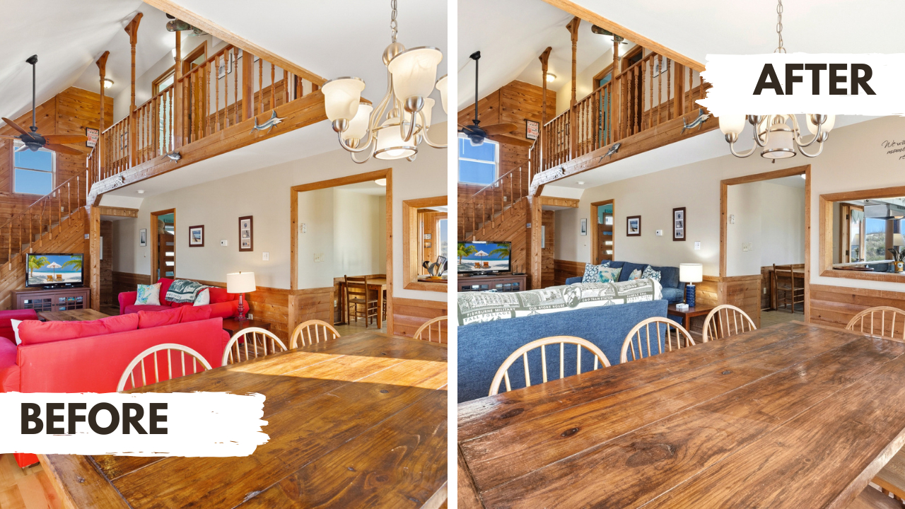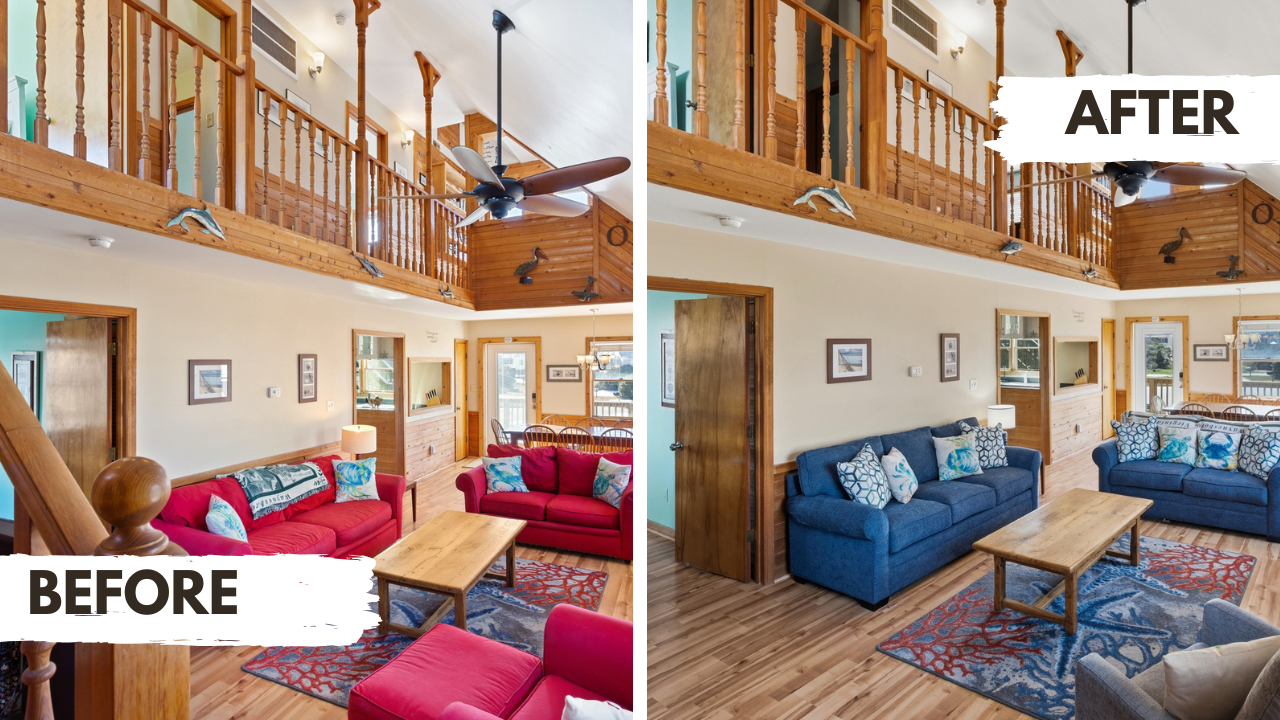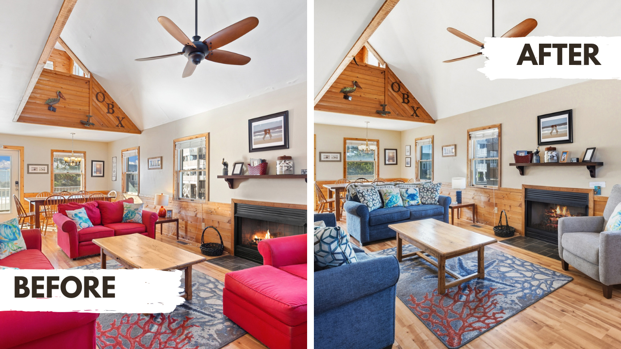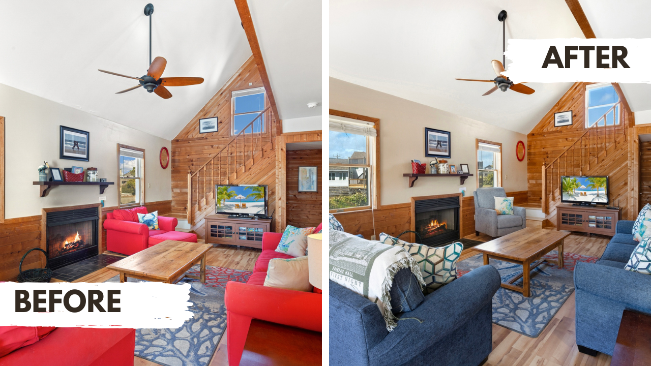 The refreshed space leans into relaxed coastal tones, making the entire main living and kitchen areas feel brighter, more open, and effortlessly OBX.