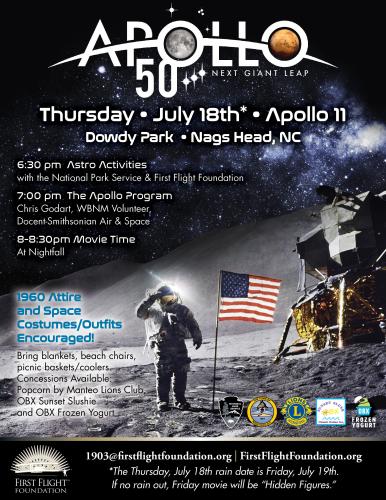 - 12:00 PM: “Apollo 11, Final Chapter in the Space Race” at Wright Brothers National memorial - program presented by Chris Godart with the National Park Service on the Apollo 11 mission