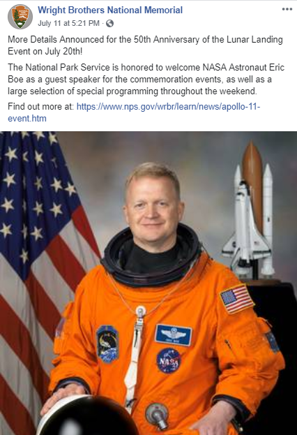 Fifty years ago, hundreds of visitors gathered around for a live broadcast of the moon landing at the Wright Brothers National Memorial and now you get a chance to relive that important moment in history! Joining the celebration is NASA astronaut Colonel Eric A. Boe as special guest speaker. Not only will he be giving a presentation on his experiences but you’ll get an opportunity to meet him for yourself!