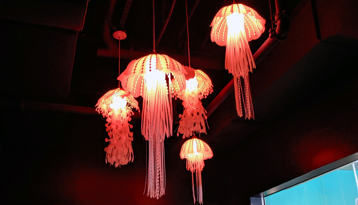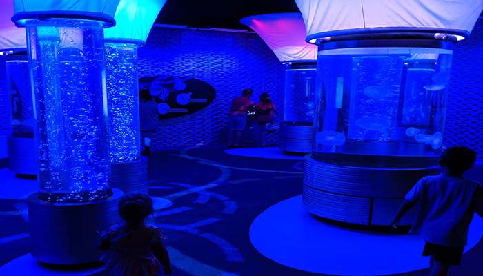 The next exhibit is the Delicate Drifters Exhibit—an exhibit all about jellyfish! The unique bubble tanks and wavy textured walls give the exhibit a fun “futuristic” feel that will make the kids go, “Whoa!” as soon as they walk in.