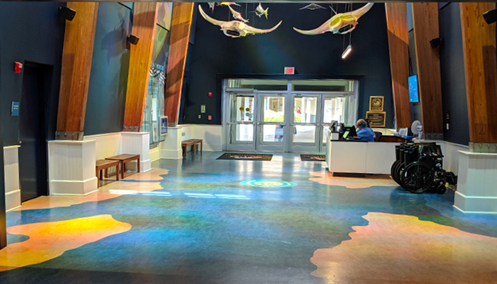 The fun begins before you even enter the lobby! Right after you purchase your tickets as you walk in, there’s a beautiful pond structure and shark statue that the kids will surely want to stop at for photos. There’s also a Fossil Hunt pit with a big shark tooth, a gorgeous nature trail that weaves through local vegetation, and a large bronze turtle (another great photo op!). The grounds are beautifully decorated at this soundfront location and visitors can also walk out on the long wheelchair accessible Soundside Pier to really get a good look at the water!