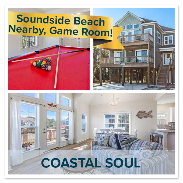 With 4 bedrooms, all of which open out onto a beautiful deck, and 3.5 bathrooms, Coastal Soul has everything you need for the ultimate Outer Banks vacation experience. Enjoy easy walking access to Jockey’s Ridge State Park and the Soundside Park Beach Access less than a mile away, with a deeded, cleared walking path directly behind the home. With a Game Room, Gourmet Kitchen with all stainless steel appliances, and 4 Exterior Decks, Coastal Soul is sure to satisfy your soul as the Outer Banks vacation home of your dreams.