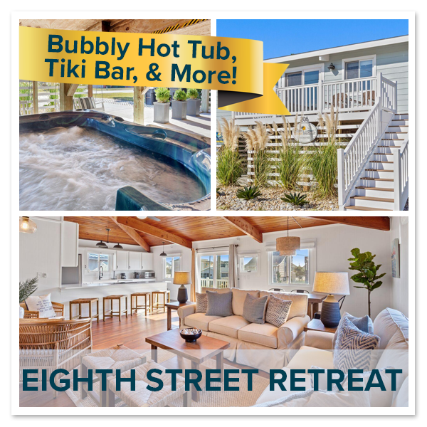 When you’re ready for that ultimate beach retreat where the air always smells like salt and there’s sand in your toes, Eighth Street Retreat is the place for you. This 4-Bedroom, 2-Bathroom beach box cottage has everything you need to get away from it all. Adorned with local artwork and sitting just 500ft from the 8th Street Public Beach Access, you’ll have everything you need to escape from the worries of the world and embrace the classic beach lifestyle for your next vacation.
