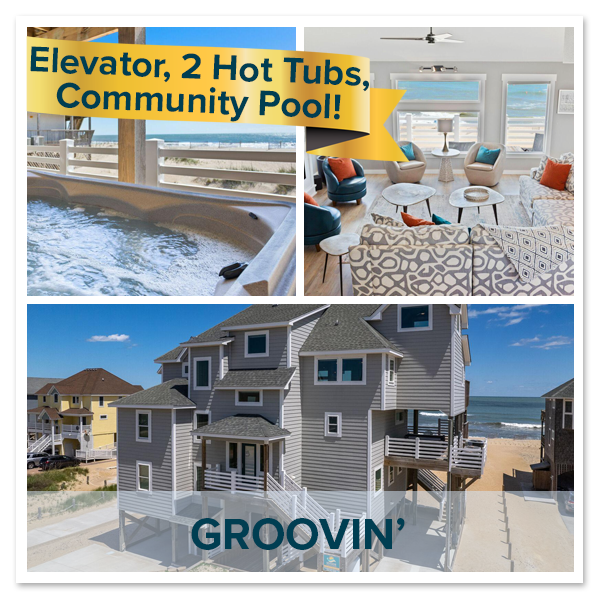 With 8 Bedrooms, 8 Full Bathrooms, and 2 Half Bathrooms, Groovin’ has everything you and your family could possibly need during your stay. Enjoy sophisticated, upscale dining in the Gourmet Kitchen and relax in the evenings in the two warm, bubbly Hot Tubs. Take advantage of the elevator with a window to get your luggage up to the rest of the home and don't forget to use the Kinnakeet Shores Community Amenities during your stay, meaning a freshwater dip in the Community Pool and a game of Tennis are just a few steps away. Take in breathtaking sunrises of the ocean from one of the three oceanside decks and enjoy an evening sunset over the sound from the loft. Check available days here.