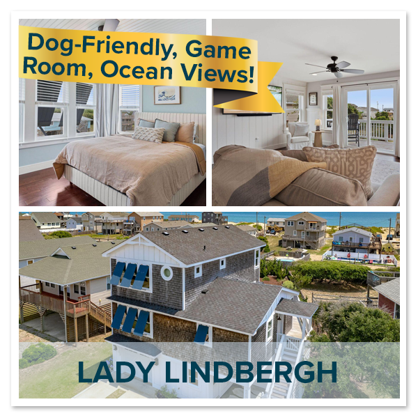 This 3-Bedroom, 3-Bathroom oceanside home is ideal for OBX getaways that your entire family will love. Enjoy warm cups of coffee on the deck with cool ocean breezes and a brilliant Outer Banks sunrise with partial ocean views. Watch TV in the cozy Living Area with plenty of comfortable furniture and beautiful beach-themed decor or relax in your own private bedroom with an airy interior and lots of natural light. Let off some steam in the Game Room with a Ping Pong table or walk less than 5 minutes directly to the beach for endless days of surf, sand, and sun. And when you stay at Lady Lindbergh, you’re just a short drive away from some of the best sites and dining on the beach! Find out more about Lady Linbergh here.