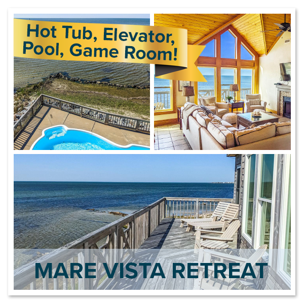 If you are looking for the ultimate soundfront retreat that feels like your own personal escape into an untouched Outer Banks paradise, Mare Vista Retreat is everything you need and more. Enjoy the quiet village of Frisco from the privacy of your own soundfront vista with a Private Pool,* warm, bubbly Hot Tub, a Loft with views of the Pamlico Sound, and plenty of room for your whole family to rest and relax in quiet, Hatteras Island Comfort. Find out more here.