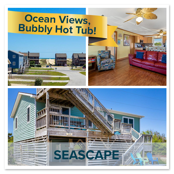 This 4-Bedroom, 2-Bathroom is the perfect place for your family to enjoy the best of what the Outer Banks has to offer. Spend the day at the beach before unwinding in the covered warm, bubbly Hot Tub and enjoy a delicious dinner together in the spacious open-concept Living and Dining Areas. Be sure to enjoy early morning sunrises over the water from the Crow’s Nest and quiet, afternoon naps in the Hammock. One stay at this oceanside oasis, and you’ll want to spend every Outer Banks vacation at Seascape.