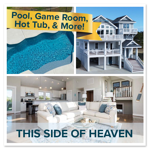 With 5 Bedrooms and 4.5 Bathrooms, This Side of Heaven offers beauty and luxury with beautiful sunsets over the Currituck Sound, a large Private Pool,* and a warm, bubbly Hot Tub. Spend your evenings in the Screened-In Porch, while multiple decks offer a quiet retreat for morning cups of coffee and an evening of stargazing. Once you’ve found your way to This Side of Heaven, you’ll never want to leave!