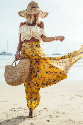 For women and people looking to dress more feminine, dresses, jumpsuits, or even a loose-fitting suit can be great options for beach wedding attire for female and feminine guests. Choose bright-colored fabrics (not white - obviously) such as cream or peach and feel free to experiment with length as long as it's not too short. Tea-length dress or ankle-length dresses are always a safe option. Try to avoid anything strapless, as the wind and weather on the beach can be extremely unpredictable. A light shawl, wrap, or scarf is a great way to elevate your outfit without missing the theme. Beach formal is also a great opportunity to experiment with jewelry like a statement necklace or hoop earrings that will give your fit a little bit of flair.