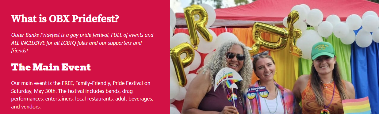 OBX Pridefest is our flagship fundraiser and includes a week of various events throughout the Outer Banks, produced by OBX Pride, Inc., a 501(c)3 local non-profit organization. Established in 2011, OBX Pride, Inc. our mission is to eliminate prejudices and discrimination toward the LBGTQ+ community, to encourage businesses to be LBGTQ-friendly, and to increase tourism to the OBX while honoring the diverse community. Pridefest week is all-inclusive and we welcome everyone.