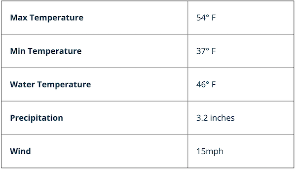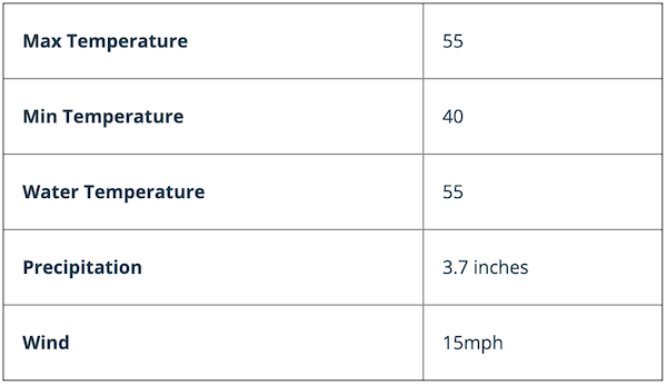 The above weather readings reflect the average temperatures (degrees Fahrenheit), wind velocity (MPH) and precipitation (inches) over a length of ten years at Cape Hatteras.